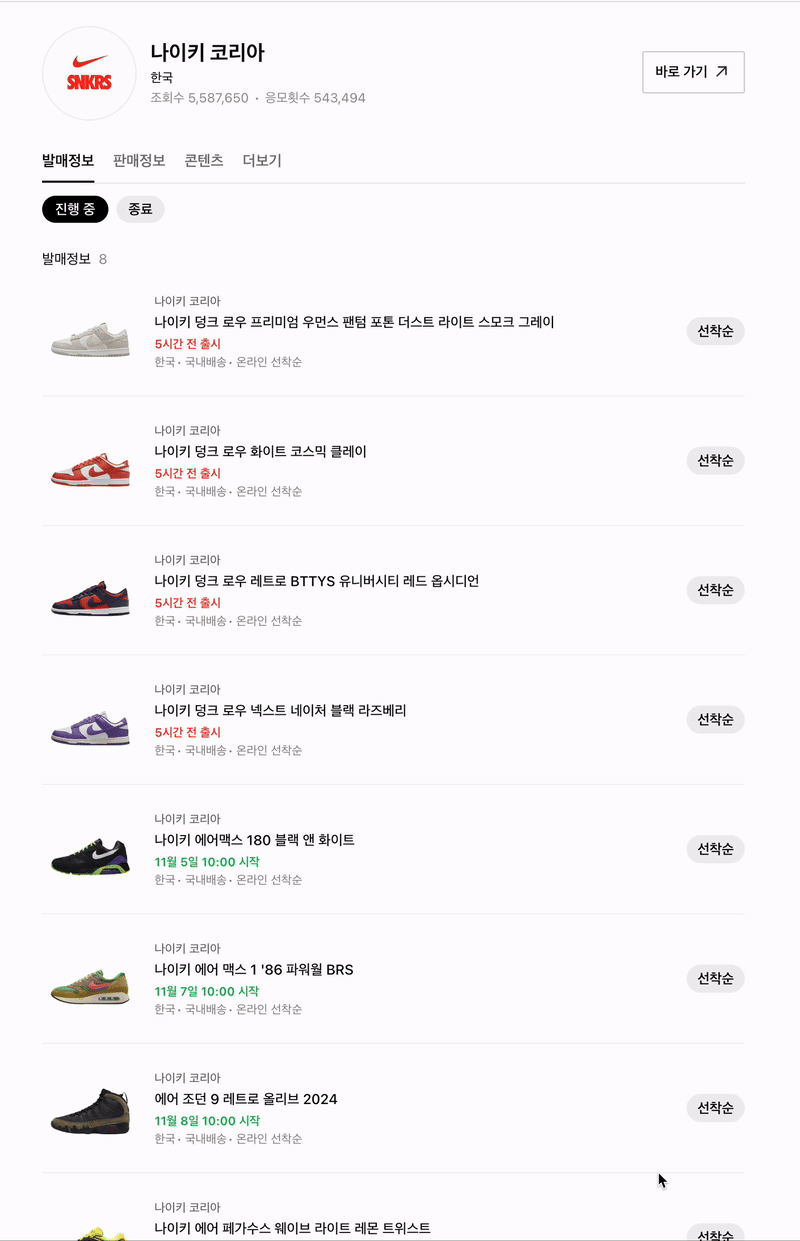 발매 정보 페이지에서는 각 발매 아이템의 '응모' 또는 '선착순' 버튼을 클릭해 상세 정보를 모달로 확인할 수 있습니다. 그러나 인기 발매일 경우 트래픽이 급증하여 버튼이 반응하지 않거나 여러 번 눌러야 모달이 뜨는 현상이 발생했습니다. 이는 사용자 불편을 초래하며 개선이 필요했습니다.