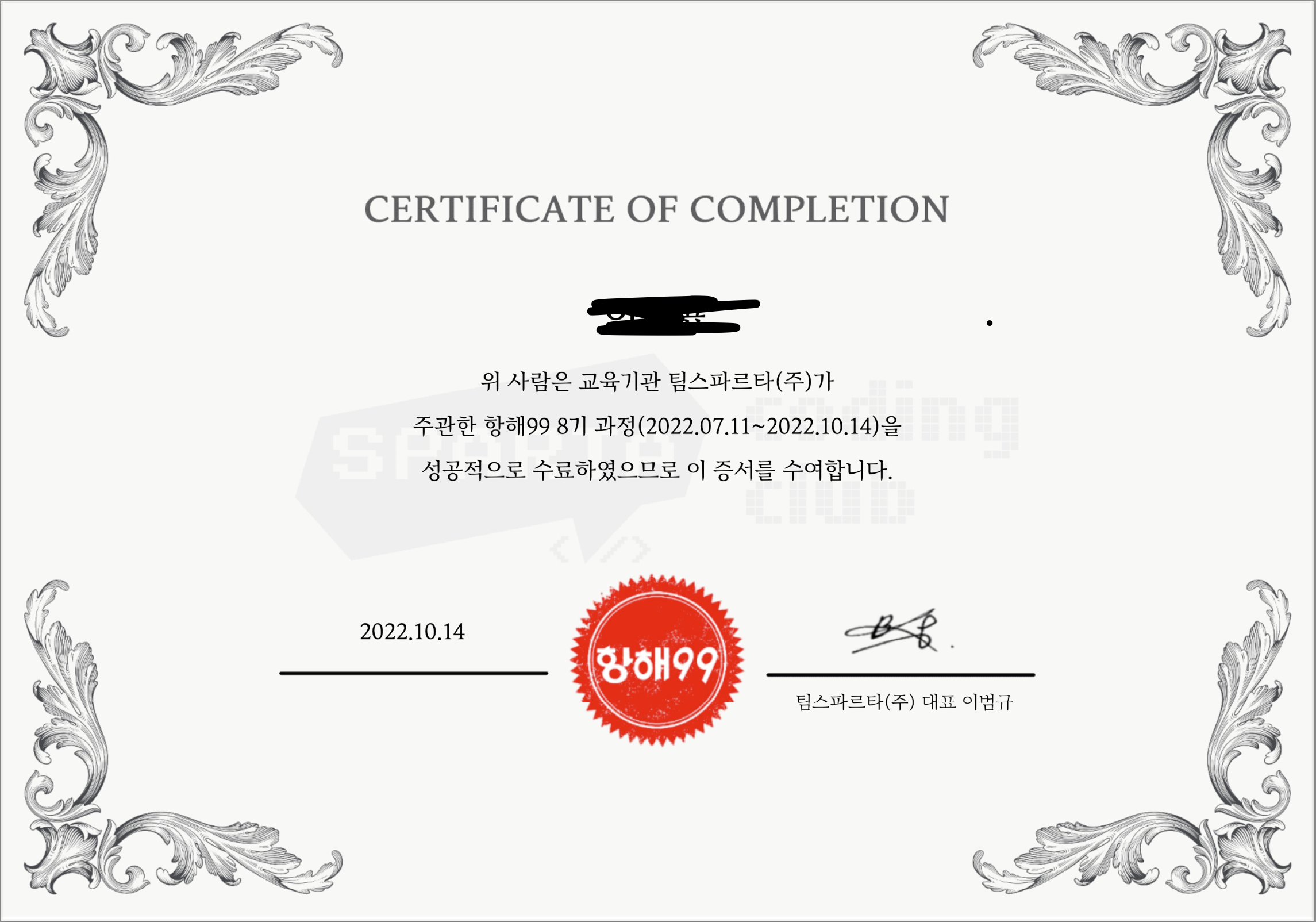 이러한 이유 때문에 먼저 지원했었지만 역시 나같은 사람들 때문인지 경쟁율이 굉장했고 절차 또한 복잡했다. 결국 불합격했고 세번째 후보였던 항해 99에 지원하여 수료했다.