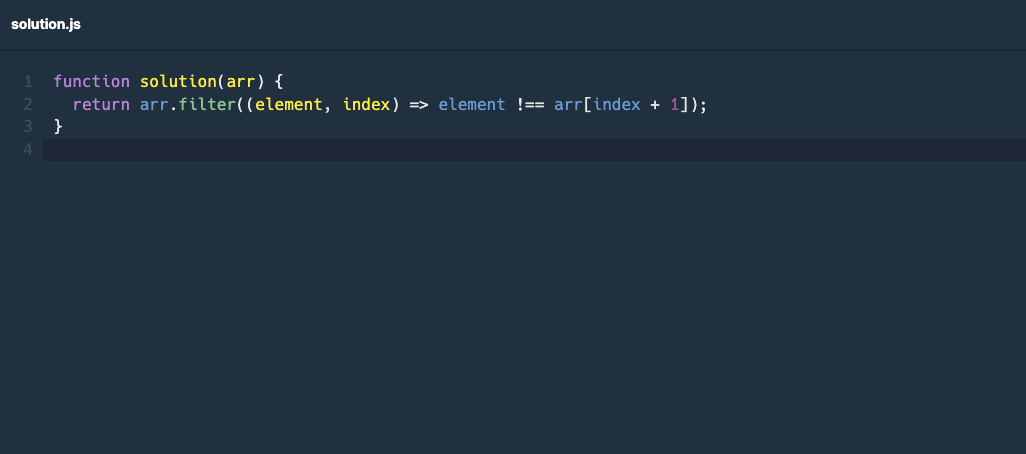 .filter()를 사용해야 겠다라는 생각이 바로 들었다. 사용해야하는 함수는 바로 생각이 나지만 어떤 방식으로 문제를 해결할지는 늘 고민이 된다. 인덱스 넘버를 이용해 요소 하나씩 다른요소들과 비교해 일치하지 않는 요소만 반환해 새로운 배열을 만든다, 즉 일치하는 요소들은 삭제된다. 이 방법은 과제인 TodoList 에서 삭제 버튼을 만드는 방법으로 사용하였다.filter() 각 요소를 시험할 함수. true를 반환하면 요소를 유지하고, false를 반환하면 버립니다.