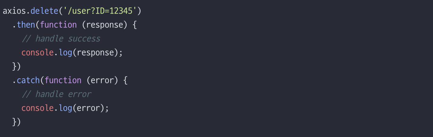 GET : axios.get(url[, config]) POST : axios.post(url, data[, config]) PUT : axios.put(url, data[, config]) DELETE : axios.delete(url[, config])