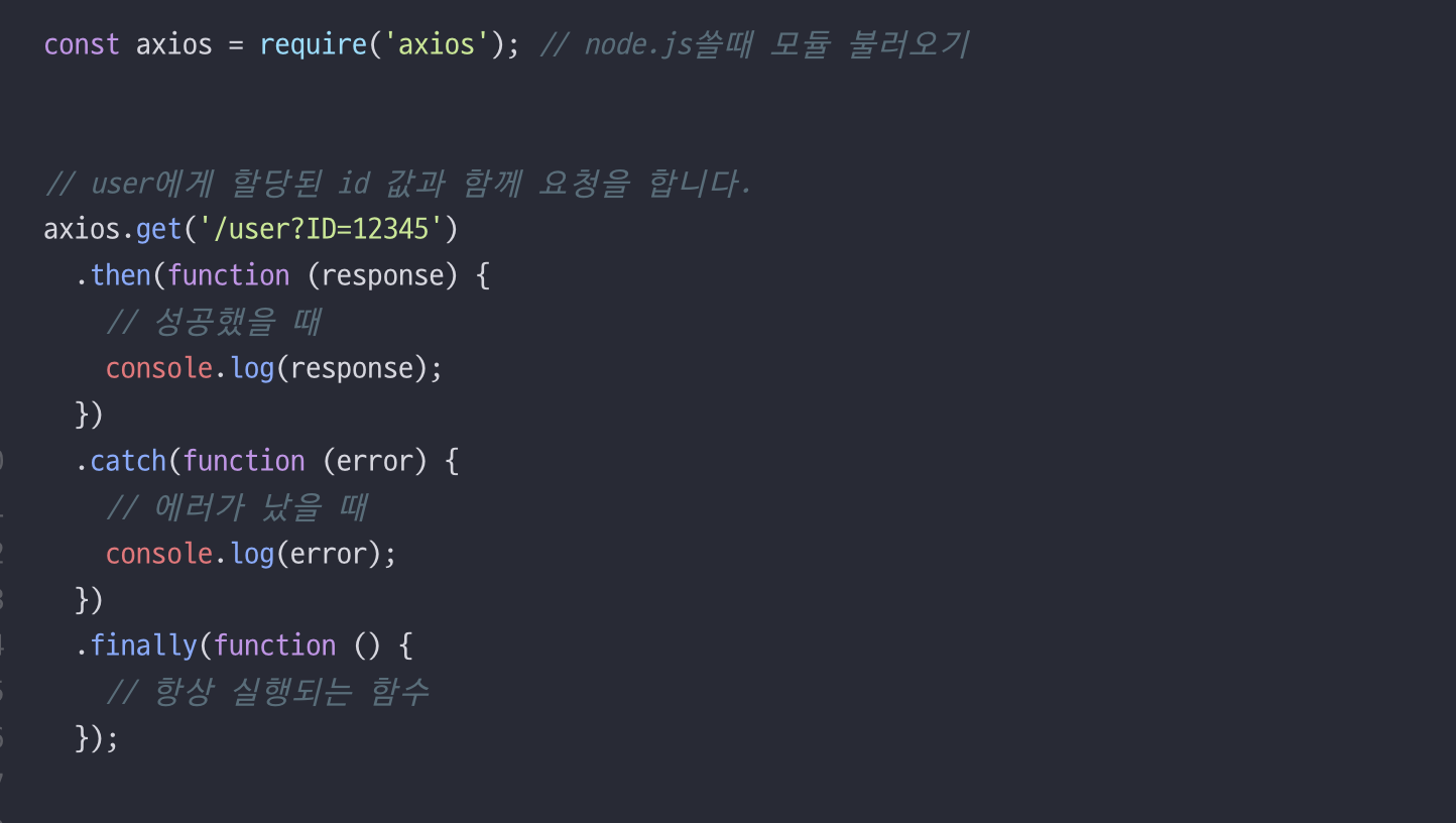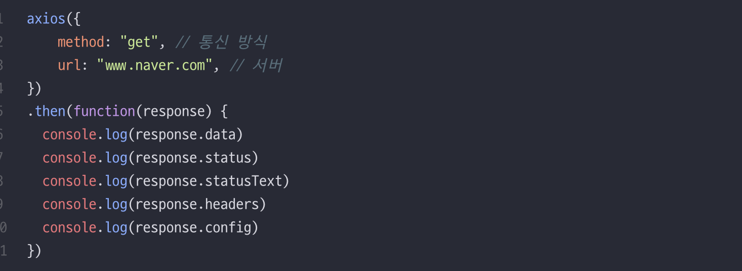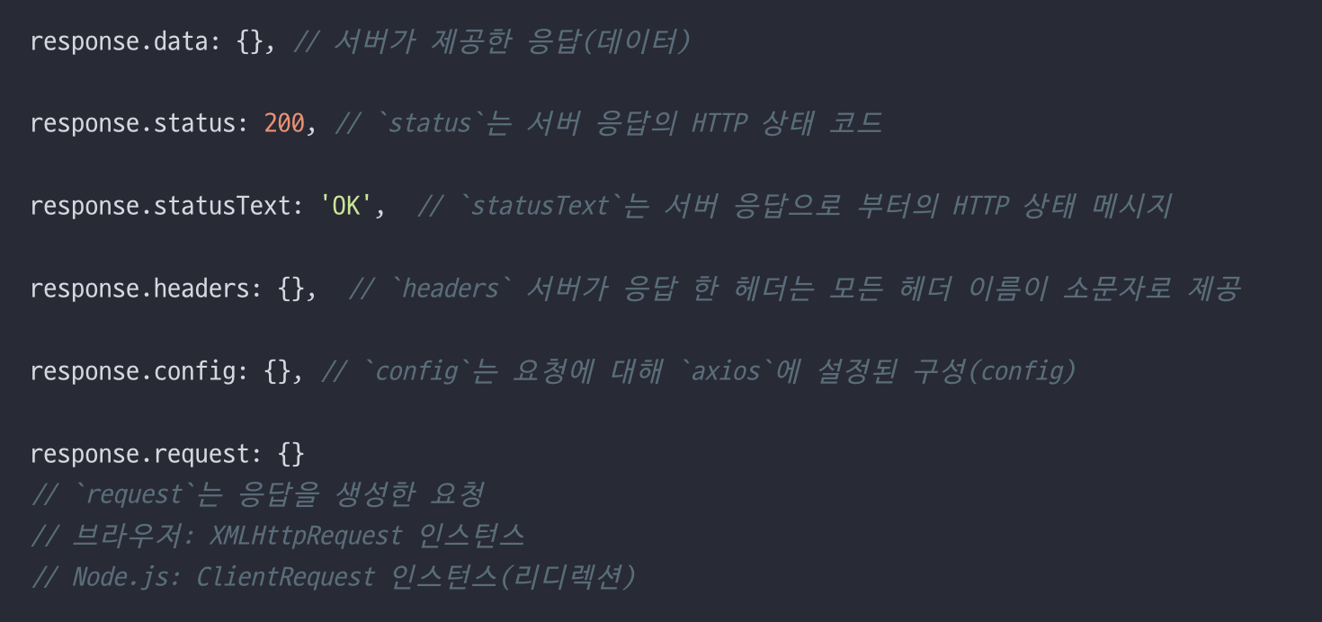 ์ด๋ฅผ .then์ผ๋ก ํจ์์ธ์๋ก(response)๋ก ๋ฐ์ ๊ฐ์ฒด์ ๋ด์ง ๋ฐ์ดํฐ๊ฐ ๋ฐ๋ก ์๋ต ๋ฐ์ดํฐ์ด๋ค.