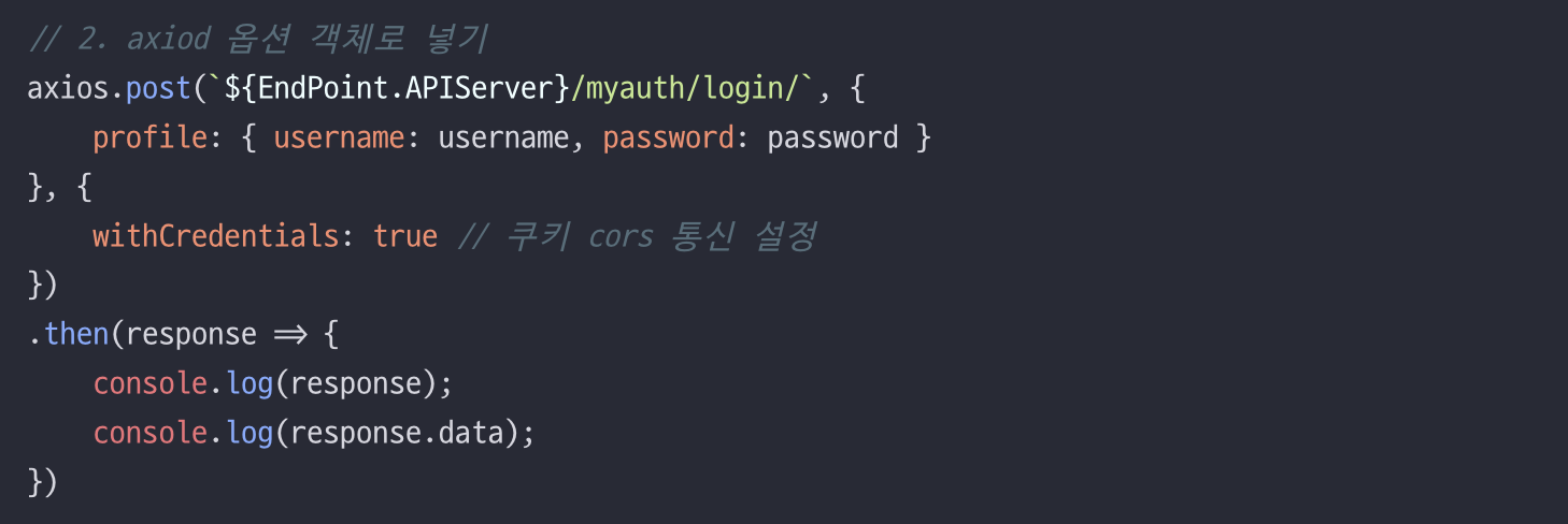 - **withCredentials **: cross-site access-control ์์ฒญ์ ํ์ฉ ์ ๋ฌด. ์ด๋ฅผ true๋ก ํ๋ฉด cross-origin์ผ๋ก ์ฟ ํค๊ฐ์ ์ ๋ฌ ํ ์ ์๋ค.