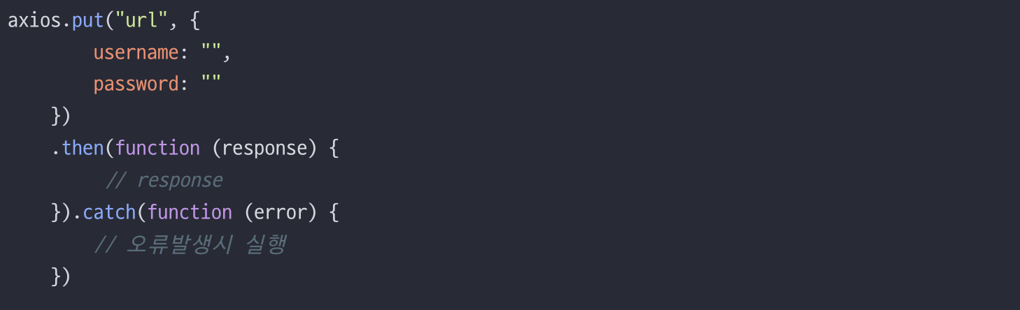 - data : ์์ฒญ ๋ฐฉ์์ด 'PUT', 'POST', 'PATCH' ํด๋นํ๋ ๊ฒฝ์ฐ body์ ๋ณด๋ด๋ ๋ฐ์ดํฐ