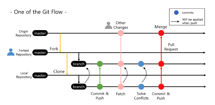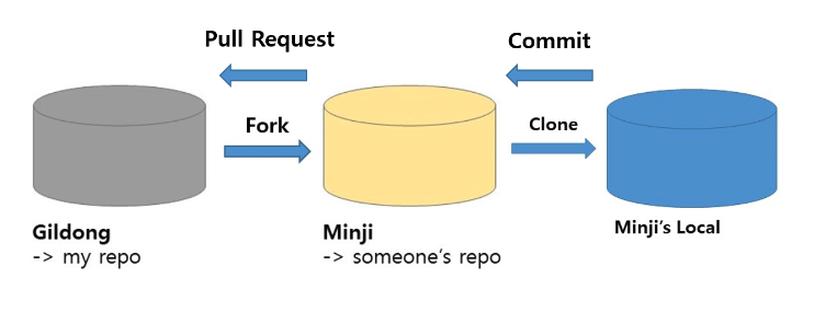 ย ์ด์ Minji ๊ฐ๋ฐ์๊ฐ ์ด๊ฒ ์ ๊ฒ ์ฝ๋๋ฅผ ์์ ํ๊ฑฐ๋ ์ ๊ทธ๋ ์ด๋ ํ ํ, ์๊น forkํ๋ Minji์ ์๊ฒฉ ์ ์ฅ์์ ์ปค๋ฐํ ๋ค, Gildong์ ๋ ํฌ์งํ ๋ฆฌ์๋ ๋ฐ์์ด ๋๋ฉด ์ข๊ฒ ๋ค ์๊ฐ์ด๋ค๋ฉด Pull Request๋ฅผ ๋ณด๋ด๋ ๊ฒ์ด๋ค. ๊ทธ๋ฌ๋ฉด Gildong์ด ์ฝ๋ ๋ฆฌ๋ทฐ๋ฅผ ํ๊ณ ๋ฌธ์ ๊ฐ ์์ผ๋ฉด ์์ ์ ๋ฉ์ธ ๋ธ๋์น์ merge๋ฅผ ํ๋ ์์ผ๋ก ํ๋ก์ ํธ๋ฅผ ๊ธฐ์ฌํ๋ ๋ฐฉ์์ด๋ค.