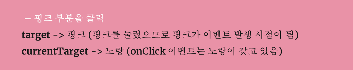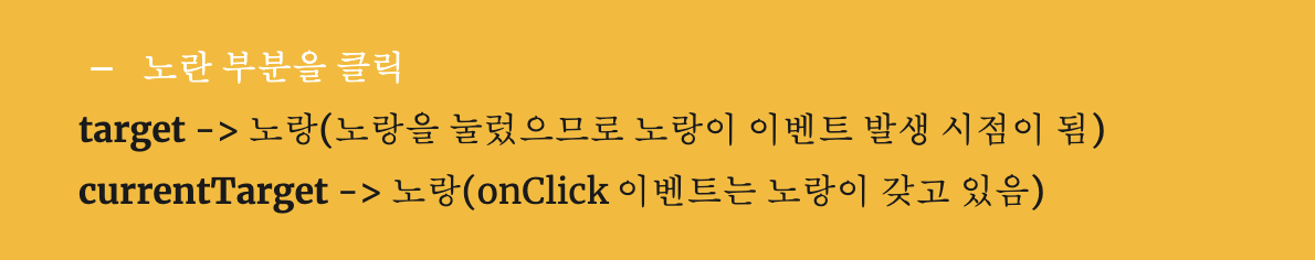 쉽게 말해 target은 누른 바로 그 것, currentTarget은 이벤트를 실행하는 바로 그 것으로 이해하면 된다.