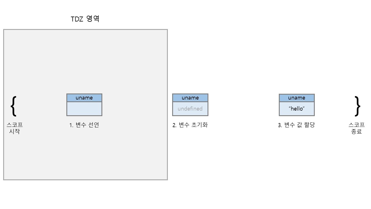 TDZ 란 Temporal Dead Zone 의 약자로 우리 말로 번역하면 일시적 사각지대라는 의미이며, 스코프 시작 ~ 초기화 시작 사이의 구간을 의미한다. 다른 말로 변수가 선언되고 변수의 초기화가 이루어지기 전까지의 구간이라고 말할 수 있다. 그림으로 표현하면 다음과 같이 표현 할 수 있을 것 같다.