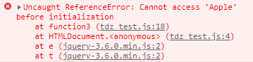 function function3() { (new Apple()).color(); class Apple { constructor() { } color() { console.log('red!'); } } } => function3 함수 스코프 안에서 class 로 선언된 Apple 이 호이스팅(선언)은 되었지만 값이 초기화가 되기 전에 Apple 클래스를 사용하려 했기 때문에 에러가 발생함