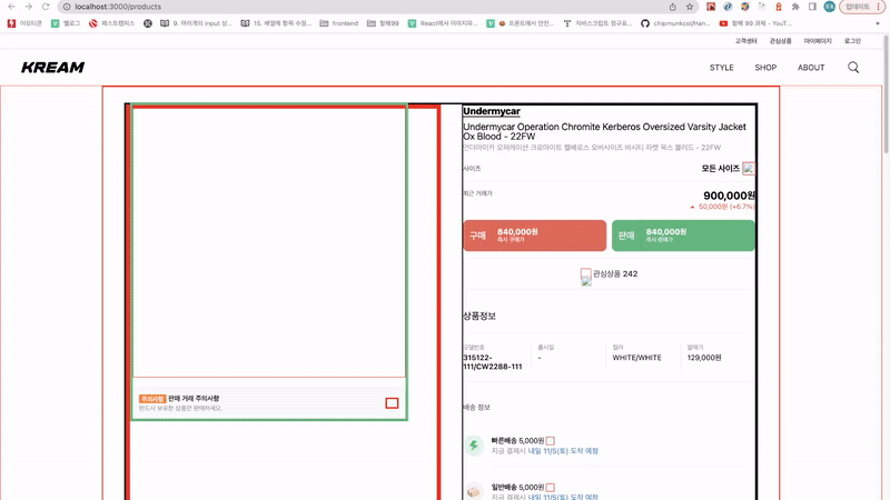 왼쪽의 캐러셀이 빨간박스에 닿으면 멈춰보이게 해야한다. (이해를 돕기위해 Kream서비스에 border를 넣었다.)