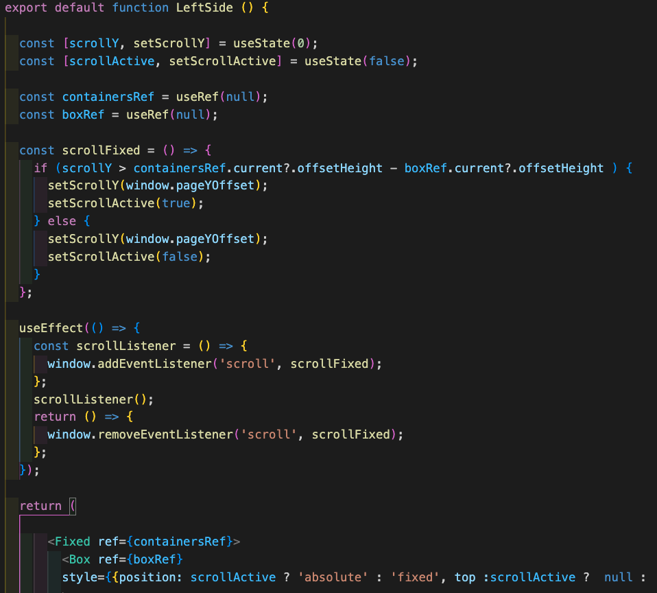 useEffect 로 실시간 감시를 해줘야한다, 즉 스크롤이 시작되면 위에 작성한 scrollFixed() 함수를 실행해준다. 주의할 점은 반드시 이벤트리스너를 삭제해 줘야 스크롤할때 2-3번씩 렌더 되지 않는다.