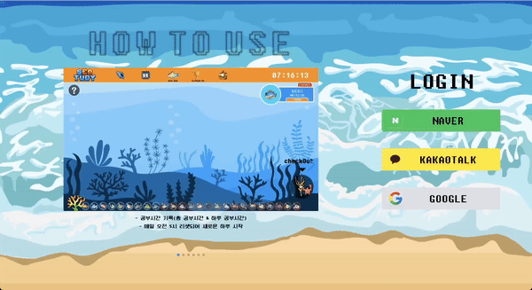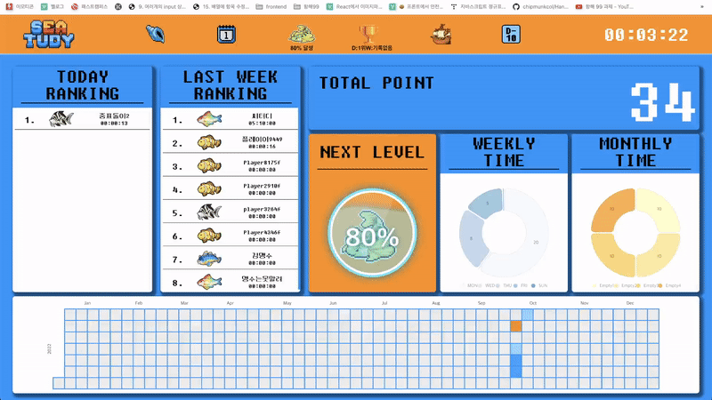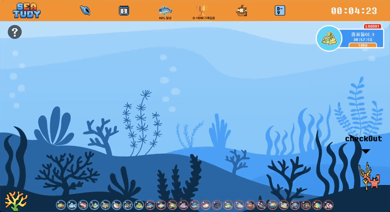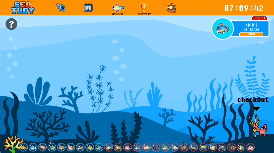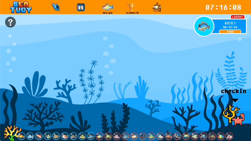 함께 공부하는 즐거움을 주어 공부에 지속적인 동기부여 를 주고, 게임화(Gamification)를 더하여 경쟁심을 자극해 자발적인 공부를 유도 하며, 자기주도 학습능력 향상을 통한 목표지향적 능력 개발 도모 하는 서비스를 만들고 싶었습니다. 공부포인트를 쌓아 물고기캐릭터도 모으고, 랭킹 시스템을 통해 재밌게 공부해보세요!
