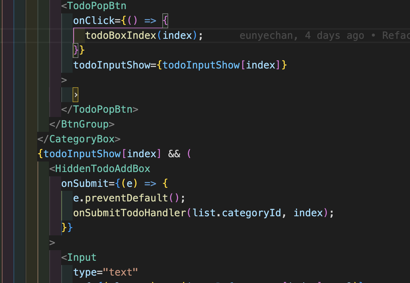 카테고리를 추가하고 투두리스트 입력창을 열어 카테고리에 맞는 투두리스트를 추가할 수 있다. 하지만 .map() 함수를 이용해 그리고 있어 하나의 투두리스트 입력창만 열고 싶지만 모든 투두리스트 의 입력창이 열린다. 이를 해결하기위해 처음으로 .map()의 Index 파라미터를 제대로 사용해보았다.