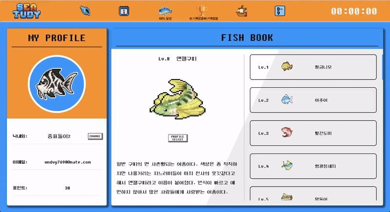 - 공부량을 기반으로 unlock된 물고기를 나의 프로필 사진으로 바꿀 수 있다.