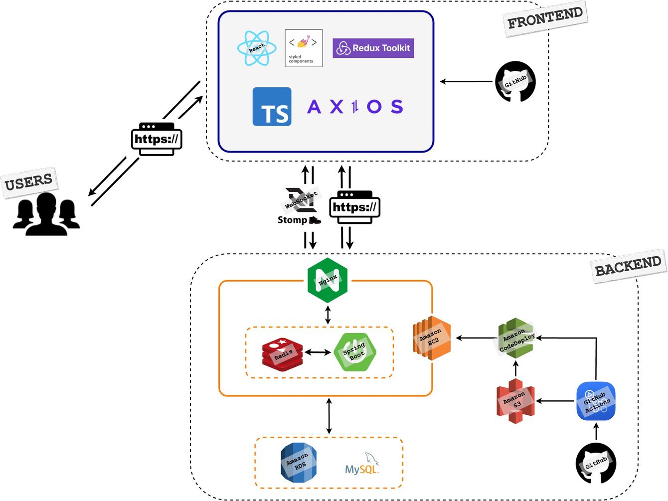 |사용 기술|기술 설명 | |------|---| |TypeScript|코드에 목적을 명시하고 목적에 맞지 않는 타입의 변수나함수들에서 에러를 발생시켜 버그를 사전에 제거하기위해 도입하였습니다.| |Redux|코드에 목적을 명시하고 목적에 맞지 않는 타입의 변수나 함수들에서 에러를 발생시켜 버그를 사전에 제거하기위해 도입하였습니다.| |Redux-toolkit|코드에 목적을 명시하고 목적에 맞지 않는 타입의 변수나 함수들에서 에러를 발생시켜 버그를 사전에 제거하기위해 도입하였습니다.| |Axios|별도의 모듈을 설치해야하지만 브라우저 호환성과 자동으로 JSON데이터 형식으로 바꿔준다는 점,promise API를 사용할 수 있다는 점을 고려햐여 도입하였습니다. | |Styled-components| 조건부 스타일링과 CSS-in-JS 방식으로 자바스크립트 환경을 최대한 활용하기 위해 도입했습니다.| |Stomp|프론트엔드와 백엔드의 효율적인 협업을 위해, 자동배포를 진행했습니다.| |Redis|각 채팅방에 입장한 유저들의 인원수를 카운트하기 위해 세션ID와 채팅방 정보를 저장해둘 필요가 있었고, RDS를 사용하기에는 잦은 채팅방 입장/퇴장 이벤트가 일어나기 때문에 쿼리문을 계속해서 보내줄 필요없는 in-memory DB ‘Redis’가 최적이라고 생각하였습니다.| |Oauth 로그인|사용자들이 회원가입의 번거로움을 덜고, 편리하게 서비스를 이용할 수 있도록 하기위해 사용하였습니다.| |Nginx|DDos와 같은 공격으로부터 보호하고(Https SSL 인증서), 좀 더 빠른 응답을 위해 적용하였습니다.| |Github Actions|프론트엔드와 백엔드의 효율적인 협업을 위해, 자동배포를 진행했습니다.| |MySQL|프론트엔드와 백엔드의 효율적인 협업을 위해, 자동배포를 진행했습니다.|