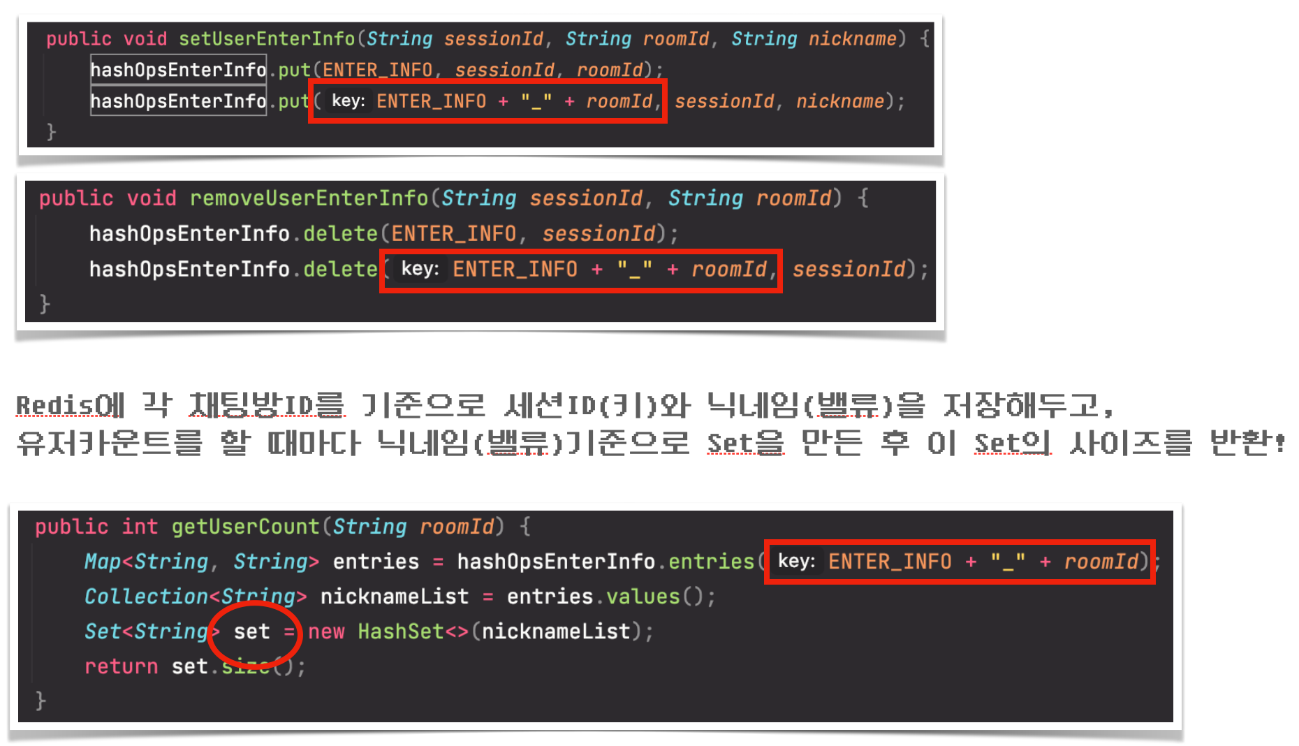 입장시, 1번과 동일하게 value 기준으로 Set을 만들어 카운트(중복제거)하고, 퇴장시 세션ID(키)를 찾아 제거 후 다시 value기준 Set으로 카운트