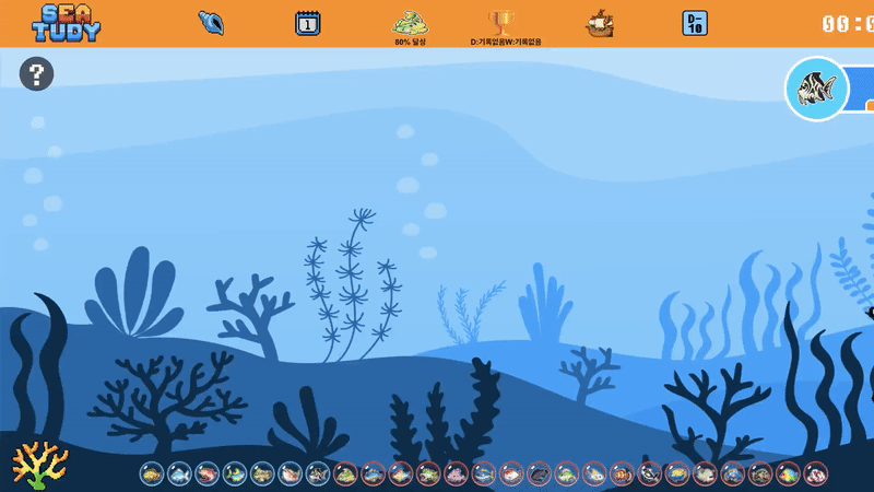 학습한 시간에 따라 물고기를 획득할 수 있으며 획득한 물고기는 파란물방울로 표시된다.