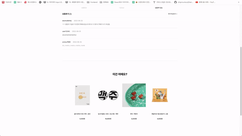 - 상세페이지 하단의 랜덤추천 품목들은 컴포넌트로 분리되어있다. 이 상태로 부모요소인 state가 변하면 자식인 랜덤추천품목들이 계속해서 렌더링 된다. 즉 옵션을 선택할때나 심지어 후기를 작성하는 동안에 모든것에 반응하여 랜덤추천이 계속해서 리로드 되는 문제가 발생했다.