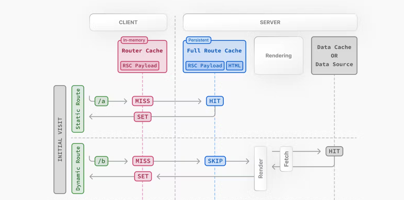 Next.js의 **정적 사이트 생성(SSG)**는 기본적으로 모든 캐싱 메커니즘을 활용하여 성능을 극대화합니다. 이를 이해하기 위해, Next.js에서의 캐시를 크게 클라이언트 캐시와 서버 캐시로 나눌 수 있습니다: