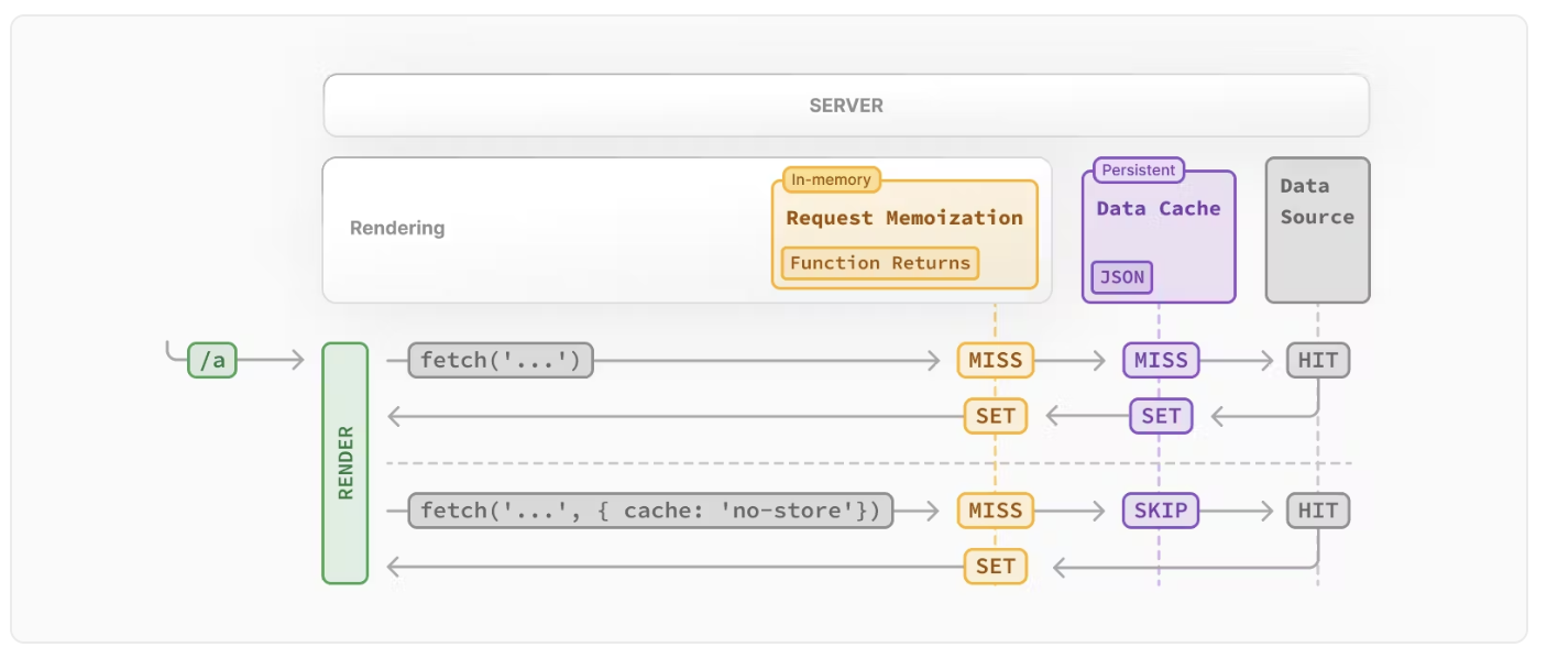Next.js는 서버 사이드 fetch 요청이 프레임워크의 지속적인 HTTP 캐시와 어떻게 상호작용하는지 구성하기 위해 Web fetch API의 캐시 옵션을 사용합니다: