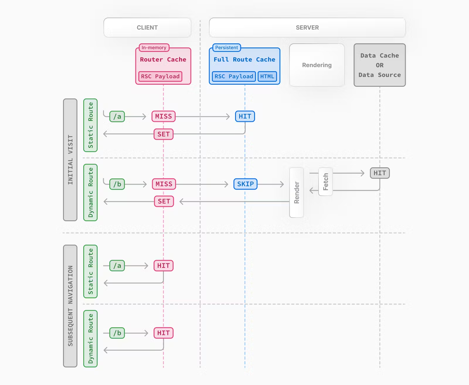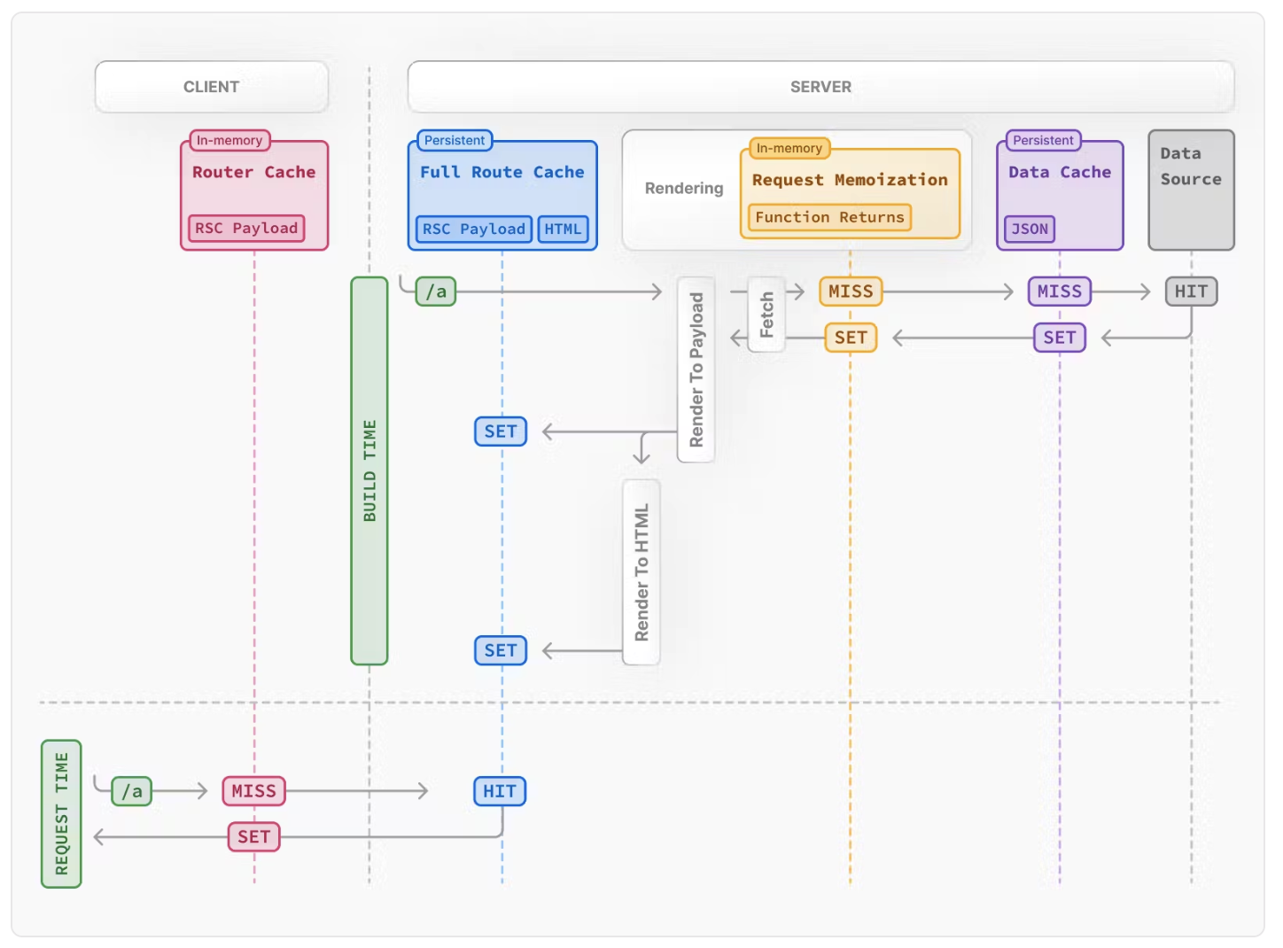 빌드 타임 동안에 ‘/a’ 페이지에 대한 서버 렌더링이 이루어집니다. 이때 필요한 데이터가 있으면, Data Source(데이터 소스)에서 데이터를 가져와 데이터 캐시에 저장합니다. 데이터 소스는 일반적으로 프론트 서버이지만, 외부 데이터를 사용하는 경우 백엔드 서버일 수도 있습니다. 이후, 데이터를 기반으로 렌더링을 수행한 결과를 풀라우트 캐시에 RSC 페이로드와 HTML 형태로 저장합니다.