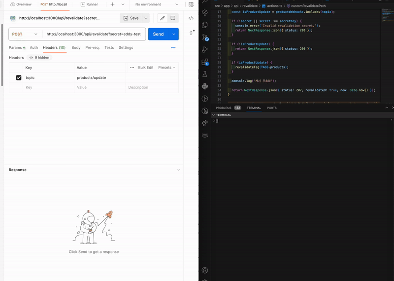 이 코드에서는 POST 요청을 처리하기 위한 API 엔드포인트를 정의하고 있습니다. 여기서 POST 함수는 revalidate함수를 호출합니다. 이 함수는 백엔드 서버에서 우리의 프론트엔드 서버로 POST 요청을 보낼 때 사용됩니다.