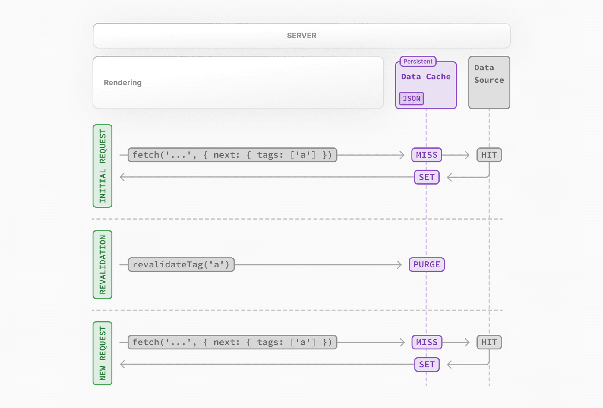POST요청을 수신하고, 지정된 태그에 따라 해당 데이터의 캐시를 무효화합니다. - 데이터 업데이트: 다음번에 사용자가 해당 페이지를 요청할 때, 새로운 데이터를 서버에서 가져와 최신 상태로 페이지를 렌더링합니다.