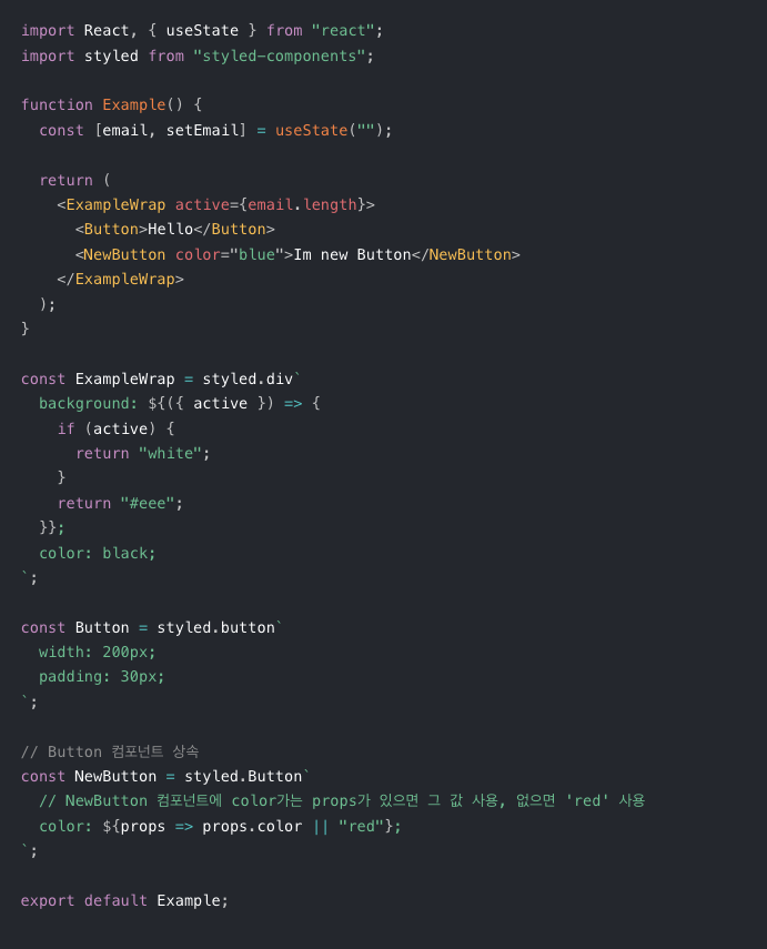 styled-component๋ฅผ ์ฌ์ฉํ๋ ์ฅ์ ์ค ํ๋๊ฐ ๋ณ์์ ์ํด ์คํ์ผ์ ๋ฐ๊ฟ ์ ์๋ค๋ ์ ์ ๋๋ค. ์ ์์๋ฅผ ๋ณด๋ฉด email์ด๋ผ๋ state๊ฐ์ ๋ฐ๋ผ ExampleWrap์ prop์ผ๋ก ๋ด๋ ค์ค active๋ผ๋ ๊ฐ์ด true or false๋ก ๋ฐ๋๊ฒ ๋ฉ๋๋ค. styled-component๋ ๋ด๋ถ์ ์ผ๋ก props์ ๋ฐ์ ์ ์๊ณ , ๊ทธ props์ ๋ฐ๋ผ ์คํ์ผ์ ๋ณ๊ฒฝํ ์ ์์ต๋๋ค.